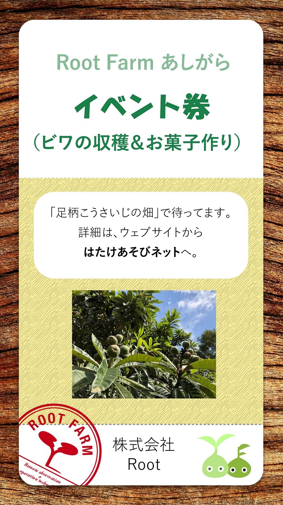 *6月17日更新 昨日、本イベントを無事に開催することができました。ご参加頂いた皆様、ありがとうございました! *6月4日追記 ビワの成熟具合が例年に比べ早く、イベントの開催日を23日(日)より、16日(日)に変更しております。ご予定頂いていた方々には大変恐縮ですが、少しでも美味しい状態で皆様に召し上がって頂きたいので、ご理解を賜りたくよろしくお願いいたします。以下、開始時間以外、変更はございません。 イベント概要 Root Farmあしがらに新たに仲間入りした『ビワ』のコンポート作りと、ビワの収穫を一緒に楽しみましょう♪ 上の写真は5月15日のビワの実の状態です。これから約1か月で完熟したオレンジ色に変化していきます。 *6月23日を予定させて頂いておりますが、ビワの生育状況によっては日程が変更となる場合がございます。その場合は30日への振り替えを予定しております。ご参加頂ける皆様へ最も美味しいビワをお届けできればと思っておりますので、予めご了承お願い致します。 ビワのコンポート作り体験 採れたてのビワを畑でコンポートにして、できたてを召し上がって頂きます!簡単な作り方で実演いたしますので、当日収穫頂いたビワは、是非お家でもコンポート作りにチャレンジしてみてください。 ビワ茶作り体験 ビワの葉でお茶なんて作れるの?とか、ビワ茶って美味しいの?とお思いになられる方もいらっしゃるかと思いますが、実はとっても簡単に作ることが出来るんです!さらに味も美味しく、ウーロン茶やほうじ茶に似ている感じです。できたてのコンポートと合わせて味わってみましょう! ビワの収穫体験 参加者の皆様に実際に収穫頂くビワの木です。写真の通り私の何倍もある大木には、上から手の届く下までビワが沢山なっています。 【イベントの流れ】 15時 足柄こうさいじの畑に集合 ①ビワのコンポート作り体験 ②ビワの葉でお茶淹れ ③ティータイム(実食) ④ビワの収穫体験 16時半頃 終了・解散 【予約】 以下のフォームからお申込みください。 予約フォームは、こちら。 お名前 (必須) メールアドレス (必須) 畑までの移動手段 (必須) お車電車・バスお迎えをご希望 人数 (必須) 1人2人3人4人5人以上 お問合せ・ご相談 【イベントの料金・チケット】 ■ Root Farmあしがら会員、配送収穫会員のご家族は無料です。 ■ 会員でないご家族は、以下の通りの料金となります。 現金でお支払い:一回 ¥1,000。 PayPayでの決済:一回 ¥950(5%割引)。 オンライン購入:一回 ¥950(5%割引&メぇポイント交換によるクーポン使用可。) PayPayオンライン(Root Farm Shop) ■ ¥950 ← ¥1,000 ■ ¥950 ← ¥1,000 Root Farm Shopで購入 ※決済画面でクーポン使用可 皆様にお会いできますことを楽しみにしております♪ 関連ノート一覧 【開催御礼】9月10日(火)|足柄茶ラテを極める!ワークショップ 【無事開催できました】9/7(土)|畑でジビエとマリアージュ 【1/13(日)】片浦の畑で、もぎたてレモンサワーの会 【5月10日(日)】茶畑で茶摘み&美味しく淹れる!名産地足柄で茶畑体験 コメント コメント ( 5 ) トラックバックは利用できません。 Sho Saze 2019.06.06 16:51 本日時点で7〜8割の成熟です。一部完熟した物を試食しましたが、味が濃く甘さと程よい酸味が絶妙です(^^) 株式会社Root 2019.06.06 17:00 いやーコンポートの試食、本当に美味しかったです。 プラスのヒントは、ミント&炭酸水、ですかね(^ ^)。 komin 2019.06.06 23:46 びわの木って、こんなに大きいんですね(^o^) Sho Saze 2019.06.07 08:51 いくつかビワの木はありますが、これはかなりの巨木です(^^)たっくさん、ビワがなっていますよ、 komin 2019.06.07 19:45 わぁ~ すばらしい\(^o^)/