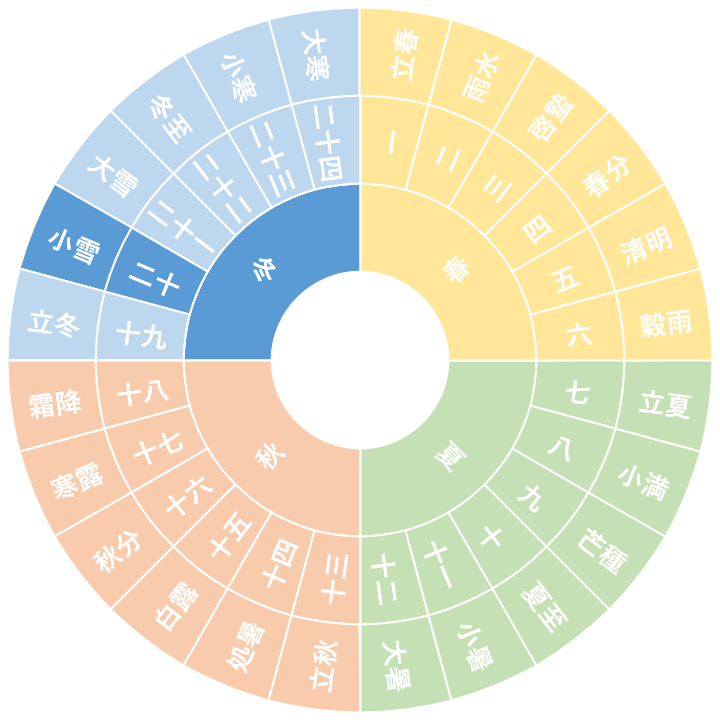 第十九節|立冬(りっとう) 【時期】 11月7日から11月21日ころまで 【季節】 秋が極まり冬の気配が立ち始める日。 『暦便覧』では、「冬の気立ち始めて、いよいよ冷ゆれば也」と説明している。 言い換えれば秋の極みともいえ、実際、多くの地域ではまだ秋らしい気配で紅葉の見時はまだ。 秋分と冬至の中間で、昼夜の長短を基準に季節を区分する場合、この日から立春の前日までが冬となる。 (Wikipediaより) 【立冬末候】 【立冬次候】 【立冬初候】 【気象データ】 平均気温最高気温最低気温日照時間降雨量風向分析 [infogram id=”55e6e281-12ae-4c38-8e9e-d06ab111a037″ prefix=”drz” format=”interactive” title=”Copy: LiveMoon”] coming soon. coming soon. coming soon. coming soon. coming soon. 【次節|小雪】 【前節|霜降】 関連ノート一覧 【第二節】雨水|うすい(2/19~3/4頃) 【雨水末候】草木萌動|そうもくめばえいずる(3/1~3/4頃) 【春分次候】桜始開|さくらはじめてひらく(3/25~3/29頃) 【大暑末候】大雨時行|たいうときどきにふる(8/2~8/6頃) コメント コメント ( 0 ) トラックバック ( 0 ) この記事へのコメントはありません。 この記事へのトラックバックはありません。 トラックバック URL 返信をキャンセルする。 ---------- OR ---------- 名前 ( 必須 ) E-MAIL ( 必須 ) ※ 公開されません URL