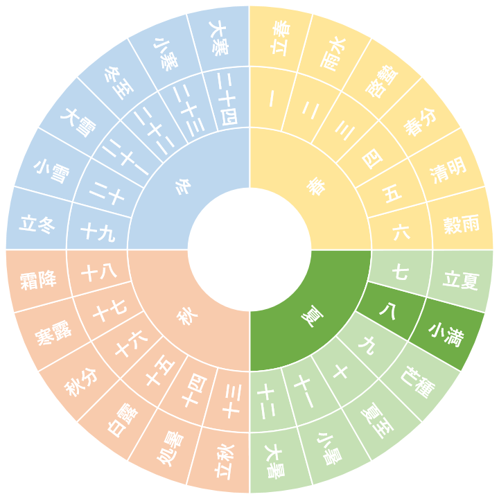 第九節|芒種(ぼうしゅ) 【時期】 6月6日から6月20日ころまで 【季節】 芒(のぎ、イネ科植物の果実を包む穎(えい)すなわち稲でいう籾殻にあるとげのような突起)を持った植物の種をまくころ。 『暦便覧』には「芒(のぎ)ある穀類、稼種する時なり」と記されている。実際には、現在の種まきはこれよりも早い。 西日本では梅雨入りのころ。沖縄県では小満から芒種が梅雨の時期に当たり、梅雨のことを沖縄方言で「小満芒種(すーまんぼーすー)」と言う。 (Wikipediaより) 【芒種末候】 【芒種次候】 【芒種初候】 【気象データ】 coming soon. 【次節|夏至】 【前節|小満】 関連ノート一覧 【第二十一節】大雪|だいせつ(12/7~12/20頃) 【立春初候】東風解凍|こちこおりをとく(2/4~2/8頃) 【大寒次候】水沢腹堅|さわみずこおりつめる(1/25~1/29頃) 【第六節】穀雨|こくう(4/20~5/4頃) コメント コメント ( 0 ) トラックバック ( 0 ) この記事へのコメントはありません。 この記事へのトラックバックはありません。 トラックバック URL 返信をキャンセルする。 ---------- OR ---------- 名前 ( 必須 ) E-MAIL ( 必須 ) ※ 公開されません URL