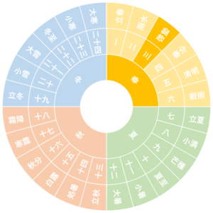 略本暦(日本) 【名称】蟄虫啓戸 【読み】すごもりむしとをひらく 【意味】冬籠りの虫が出て来る 【時期】3月5日~3月9日ころ 【二十四節気】第三節|啓蟄初候 宣明暦(中国版) 【名称】桃始華 【意味】桃の花が咲き始める 『現代版』七十二候 あなたが考える『現代版』の啓蟄初候は? 啓蟄初候 三寒四温|さんかんしおん 自由に答えを追加してね。 結果はこちら Poll Options are limited because JavaScript is disabled in your browser. 【後の候】 【前の候】 【当節|啓蟄】 関連ノート一覧 【春分次候】桜始開|さくらはじめてひらく(3/25~3/29頃) 【大雪初候】閉塞成冬|そらさむくふゆとなる(12/7~12/11頃) 【白露末候】玄鳥去|つばめさる(9/17~9/21頃) 【立冬初候】山茶始開|つばきはじめてひらく(11/7~11/11頃) コメント コメント ( 0 ) トラックバック ( 0 ) この記事へのコメントはありません。 この記事へのトラックバックはありません。 トラックバック URL 返信をキャンセルする。 ---------- OR ---------- 名前 ( 必須 ) E-MAIL ( 必須 ) ※ 公開されません URL