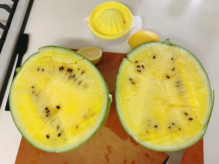 あしがらで収穫したすいか。切ったら中身は鮮やかな黄色✨ 赤いのを想像してたので、なんとなくラッキー感があります^_^ 食後のデザートやお昼のおやつとして楽しんだ後、残っていた白ワインと合わせてシャーベットにしました。夏の爽やかデザートです🎶 関連ノート一覧 里いもの素揚げ 安納芋 【明日の予行】キウイ・あやめ雪・みかんのグリーンスムージー チンゲン菜 コメント コメント ( 2 ) トラックバック ( 0 ) めろん 2020.08.17 12:07 返信 いいなー。 Chisato 2020.08.18 22:01 返信 めろんのシャーベットも美味しいと思うよ。でも、シャーベットにする前に、全部食べちゃうかもね^_^ この記事へのトラックバックはありません。 トラックバック URL 返信をキャンセルする。 ---------- OR ---------- 名前 ( 必須 ) E-MAIL ( 必須 ) ※ 公開されません URL