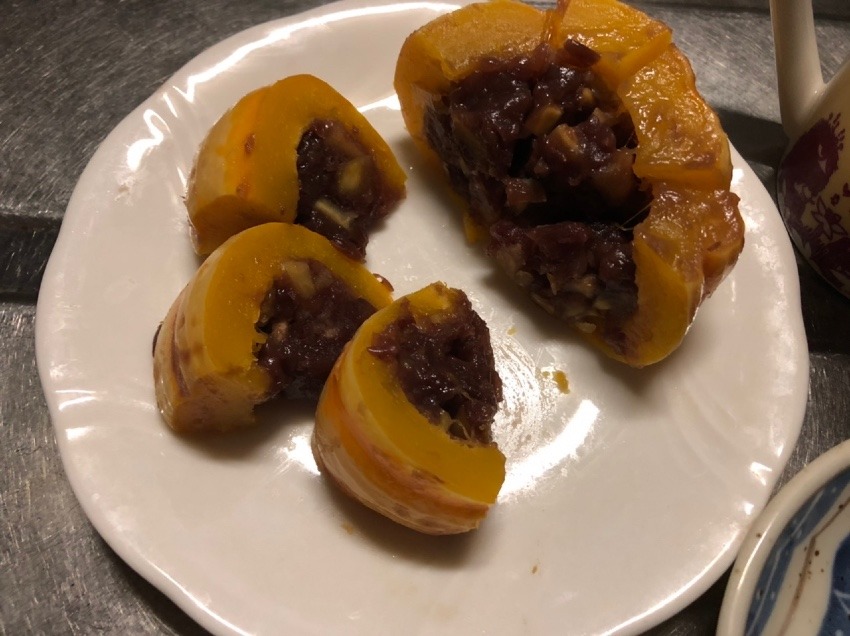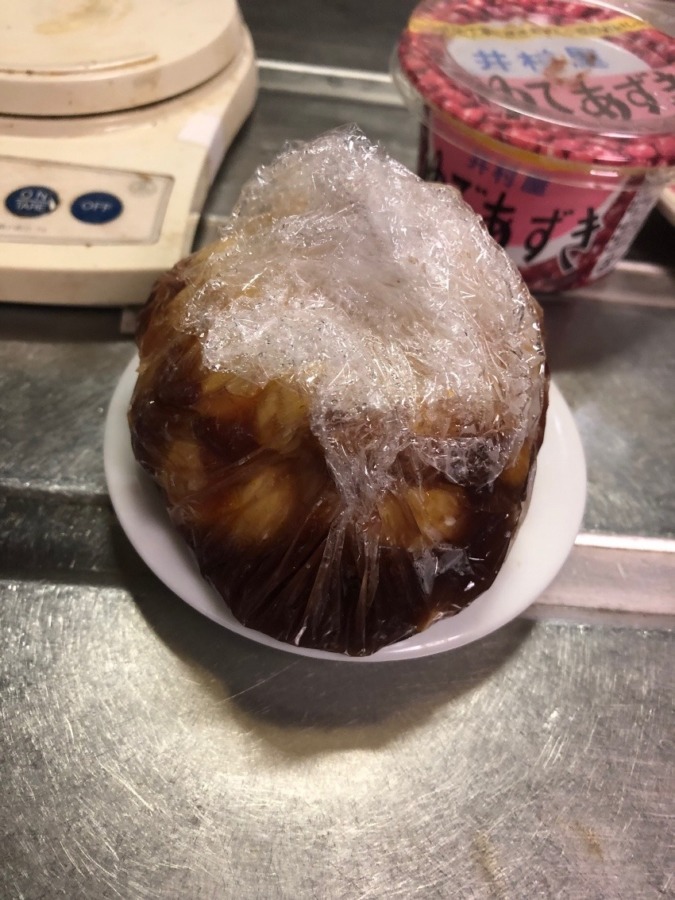 くり抜いたプッチーニにはゆで小豆が80gちょっと入りました。これを80gに減らして、小麦粉8g(大さじ1杯が9gね)とお砂糖小さじ2、茹で栗2個を細かく切って加え、よく混ぜて、例によってヘタで蓋して今回はラップに包んで700W5分、さあどうだ?
