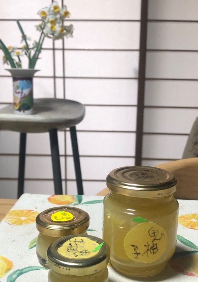 その後、家人が訪問先で鬼柚子いただいてきましたので、ママレードにしました。ウェブで調べると、苦いから白いワタをとれ、とか、3回茹でこぼして苦味を取れ、など、苦い情報が結構あるのだけど、一方で苦味に全く言及していない記事も多いのですよ。去年あたしが扱ったものは、苦くなかった。鬼柚子の系統の差か人間の苦味感受性の差か、どっちだろ。ちなみにあたしはママレードは苦いのが好きで、苦味耐性は高い。あと、良い香りがあるんだけど淡いので、何回も茹でこぼしたら飛んでしまいそうだ。なので皮はワタごと薄く切って、ちょっと水にさらしただけで果汁、刻んだ内袋(じょうのう)と合わせて煮込みました。果汁の酸が袋やワタのペクチンを引き出すので、すっごいトロトロになり、トロトロすぎて鍋の底にひっついた!だもんであまり煮詰まってないけど、砂糖、果汁とった後の果肉を足して少し煮て出来上がり。淡い、花のような香りがのこり、優しい黄色のママレードができました。うーん、てんで苦くはないぞ。果実が皮に比べて少ないんだけど、酸味もきっちり利いて、去年のよりはずいぶんマシだ、よしよし。