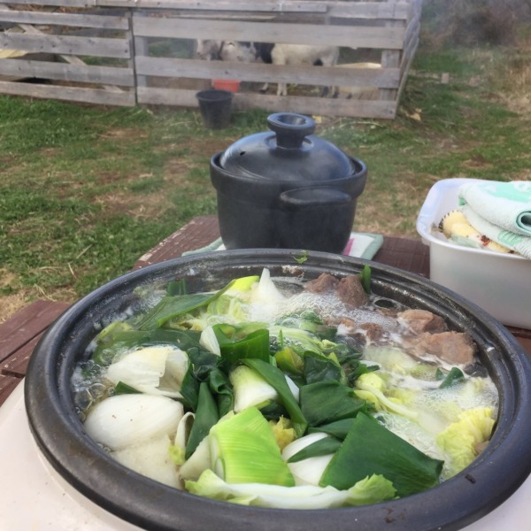 ■12:00~13:00 お昼(副菜:新米のおにぎり、鹿肉の焼肉、茹で里芋、スイカ)