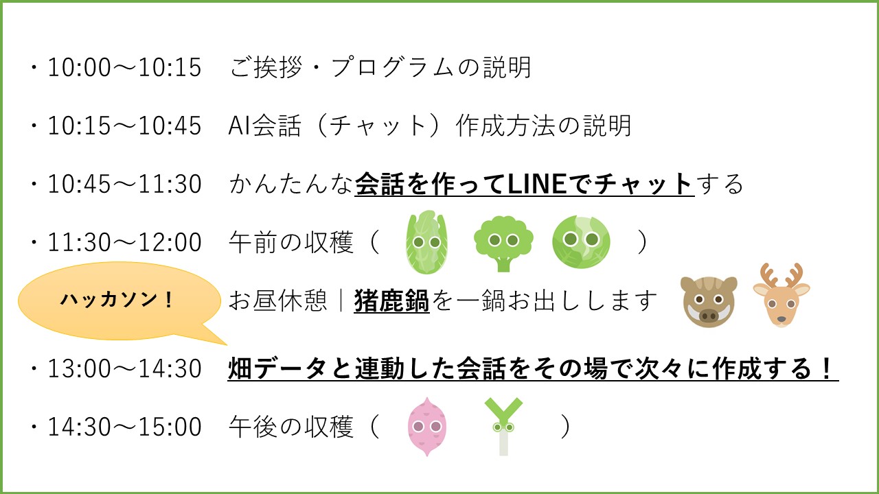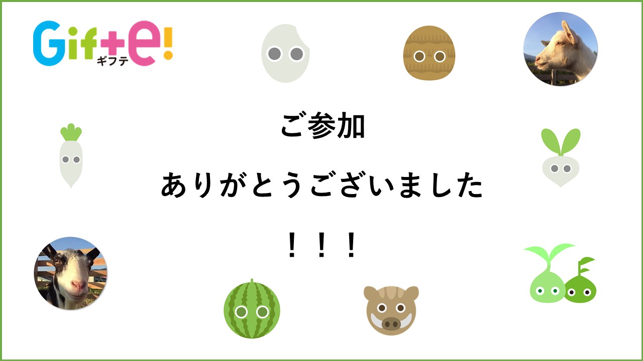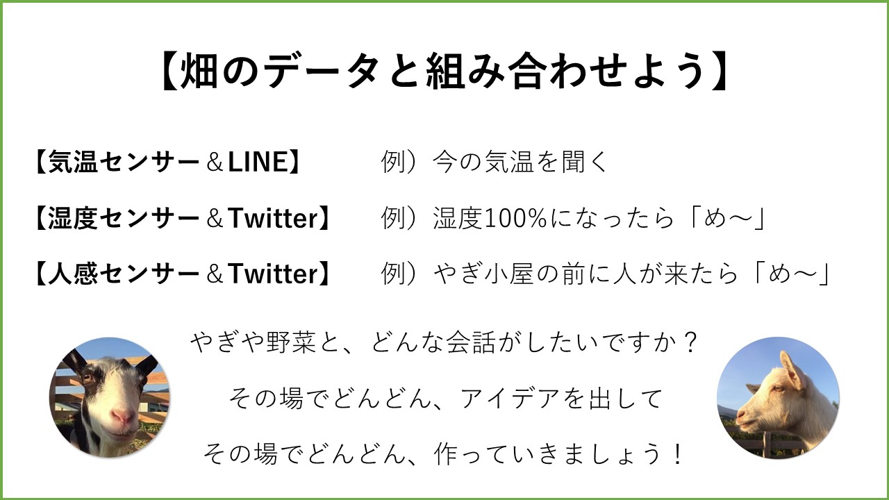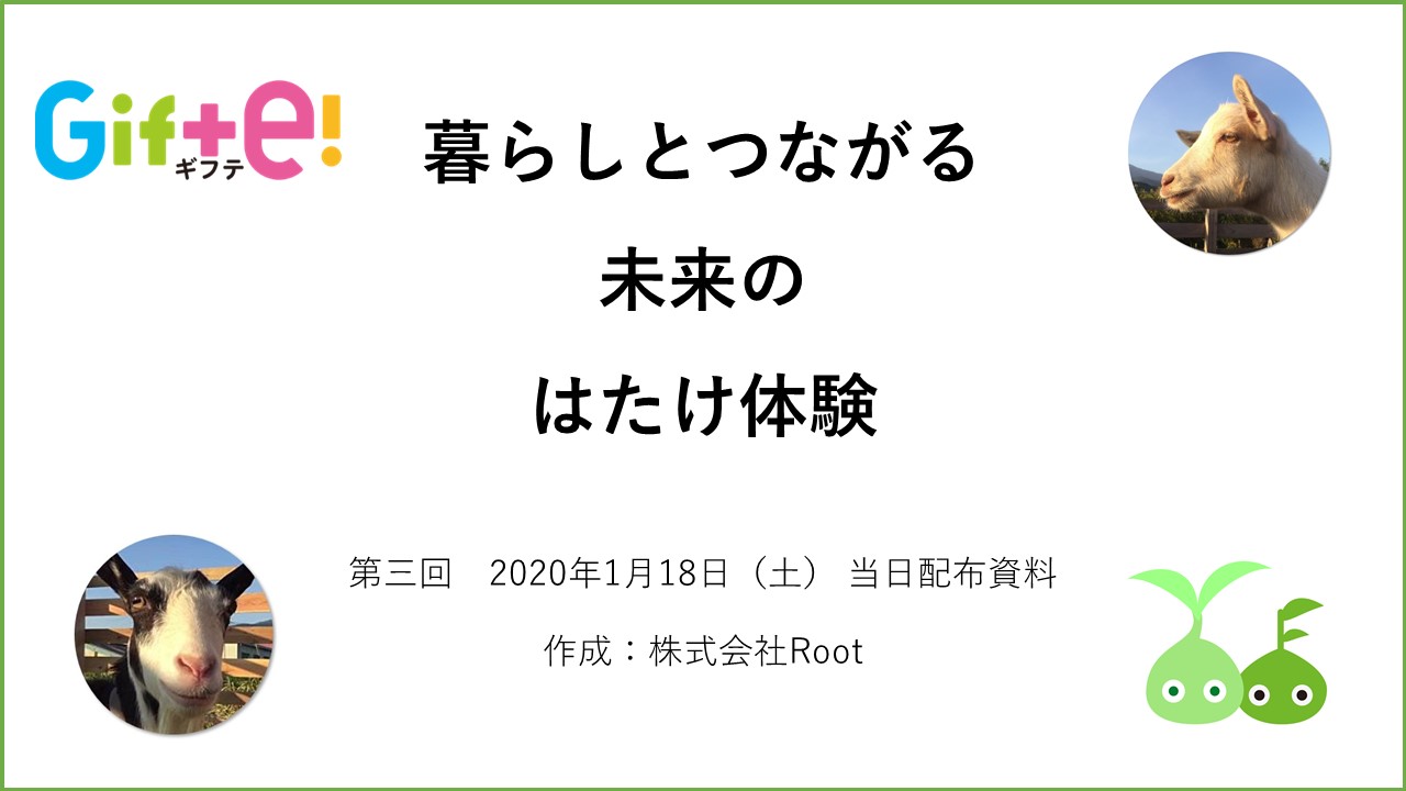 【御礼】 参加してくれた皆さんへ。 子供たちもたくさん会話を作ってくれて、みんなすごかった。本当に楽しかった。 雪だったけど、いつもと変わらずエサをくれてありがとう。 また畑来てメ。 2020.01.18はい、今日は雪でした。でも子供がたくさん来てくれたから寂しくはなかったですメ。… 2020.01.18子供たちは雪で大喜び。収穫にやぎえさに、晴れの日と変わらない元気っぷり。 … 【配布資料】 資料は、クリックすると拡大します。 【イベント詳細】 詳細・お申し込みは、ギフテ!のページをご覧ください。 ギフテ!のページへ 第一回・第二回の内容はこちらから。 2019.11.12【準備完了】ギフテ!学び体験用ページ(第二回:2019年11月30日)… 2019.10.06【必見】ギフテ!学び体験用ページ(第一回:2019年10月6日)… 関連ノート一覧 【1/19(土)】畑でゆっくりする会 【6月6日(土)/ 7日(日)】水田×IoT×AI!暮らしとつながる未来の田んぼ体験(第... 【開催御礼】12月28日(土)|はたけでゆっくりする会(はたけ納め) 【5月10日(日)】茶畑で茶摘み&美味しく淹れる!名産地足柄で茶畑体験 コメント コメント ( 1 ) トラックバック ( 0 ) やぎ子さん 2020.01.08 20:58 返信 なんとAIハッカソンにもトライ。すごいyo。 この記事へのトラックバックはありません。 トラックバック URL 返信をキャンセルする。 ---------- OR ---------- 名前 ( 必須 ) E-MAIL ( 必須 ) ※ 公開されません URL
