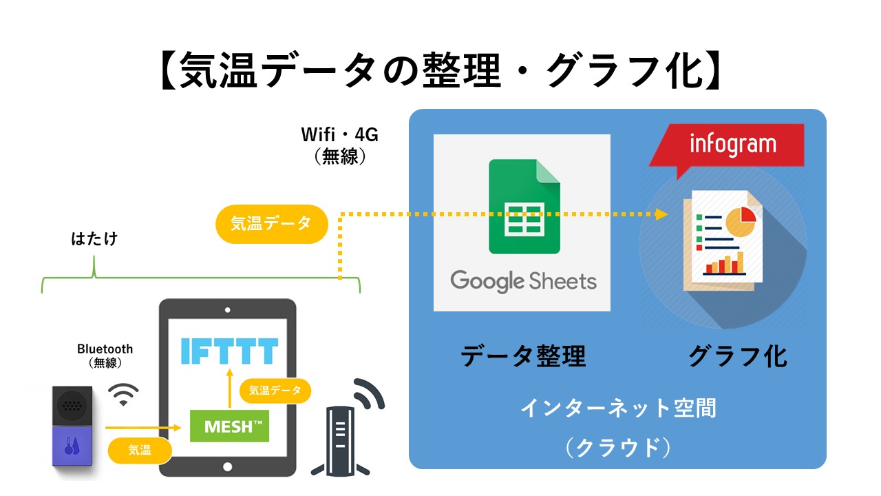 はたけのデータ:MESH実験用 やぎ子です。 こちらは「MESH」というIoTデバイスを使った実験スペース。 10月6日(土)の当日に、みんなで作った「メっっ!!」と驚くグラフがこちら。 ↓ [infogram id=”792a8dbd-703c-4980-90ee-890fa498a46d” prefix=”Ngd” format=”interactive” title=”ギフテ!MESH実験用”] Google Sheetの中身を見る 開発システムの図解 ※画像をクリックすると拡大します。 はたけのデータ:分析用 ルナだヨ。 ここでは、気象庁による足柄のデータを分析しているyo。 二回目(11月30日)の時に詳しく勉強するはず! ルナは、データ分析ちょー得意。 『はたけひろば』で、私の分析も見つけてみてメ。 [infogram id=”738a4294-b40f-4e11-bb8c-c012f46755e4″ prefix=”T4T” format=”interactive” title=”ギフテ!IoT専用”] みんなの野菜の「いま」を観察 以下のボタンから、各野菜のマイページで生育状況を確認することができます。 だいこん ギフテ!だいこんマイページ こかぶ ギフテ!こかぶマイページ あやめ雪 ギフテ!あやめ雪マイページ 関連ノート一覧 【準備完了】ギフテ!学び体験用ページ(第二回:2019年11月30日) 【お天気やぎ子さん】今日のはたけはどんな感じ? 【分析ルナちゃん】2020年6月はこんな感じ はたけでお化け発見👻 コメント コメント ( 4 ) トラックバック ( 0 ) やぎ子さん 2019.10.03 17:21 返信 すごそう。いよいよですメ。 みづきくん 2019.10.19 17:32 返信 台風すごかった。野菜大丈夫かな? ギフテ!だいこん 2019.10.19 17:40 返信 ご心配ありがとう。台風二日後の私の様子は、こちらだyo。↓ 『台風二日後の姿。ここからの復活に期待。』 ギフテ!あやめ雪 2019.10.19 17:43 返信 私の様子は、こちらから。↓ 『台風二日後の姿。わりとダメージなし。』 この記事へのトラックバックはありません。 トラックバック URL 返信をキャンセルする。 ---------- OR ---------- 名前 ( 必須 ) E-MAIL ( 必須 ) ※ 公開されません URL