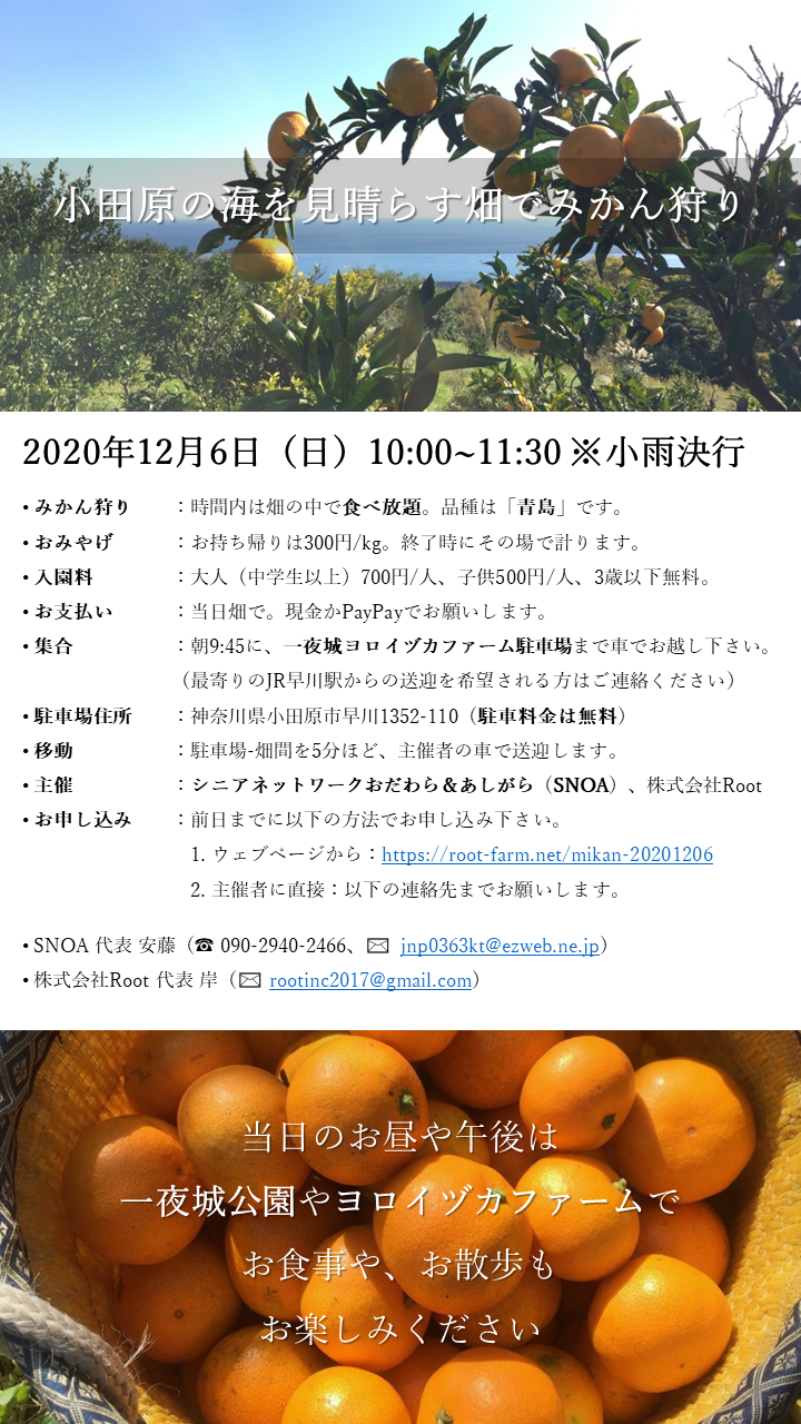 お申し込み 必須お名前 必須メールアドレス 必須駐車場までの移動手段 お車JR早川駅まで送迎を希望 必須人数 1人2人3人4人5人以上 任意メッセージ 関連ノート一覧 【1/13(日)】片浦の畑で、もぎたてレモンサワーの会 【開催御礼】11月9日(土)|茶畑で整枝&美味しく淹れる!名産地足柄で茶畑体験 【開催御礼】12月28日(土)|はたけでゆっくりする会(はたけ納め) 【1/19(土)】畑でゆっくりする会 コメント コメント ( 0 ) トラックバック ( 0 ) この記事へのコメントはありません。 この記事へのトラックバックはありません。 トラックバック URL 返信をキャンセルする。 ---------- OR ---------- 名前 ( 必須 ) E-MAIL ( 必須 ) ※ 公開されません URL