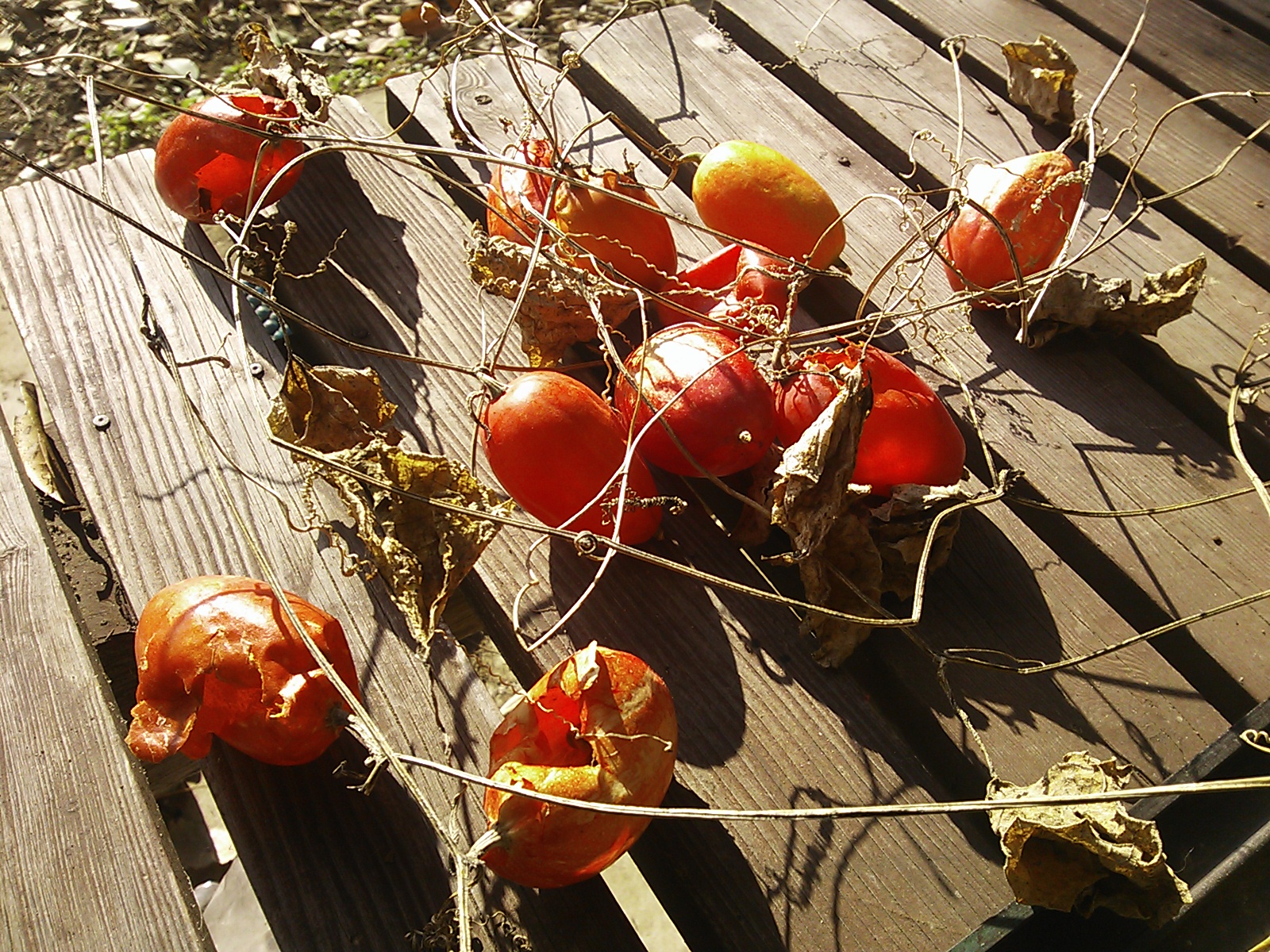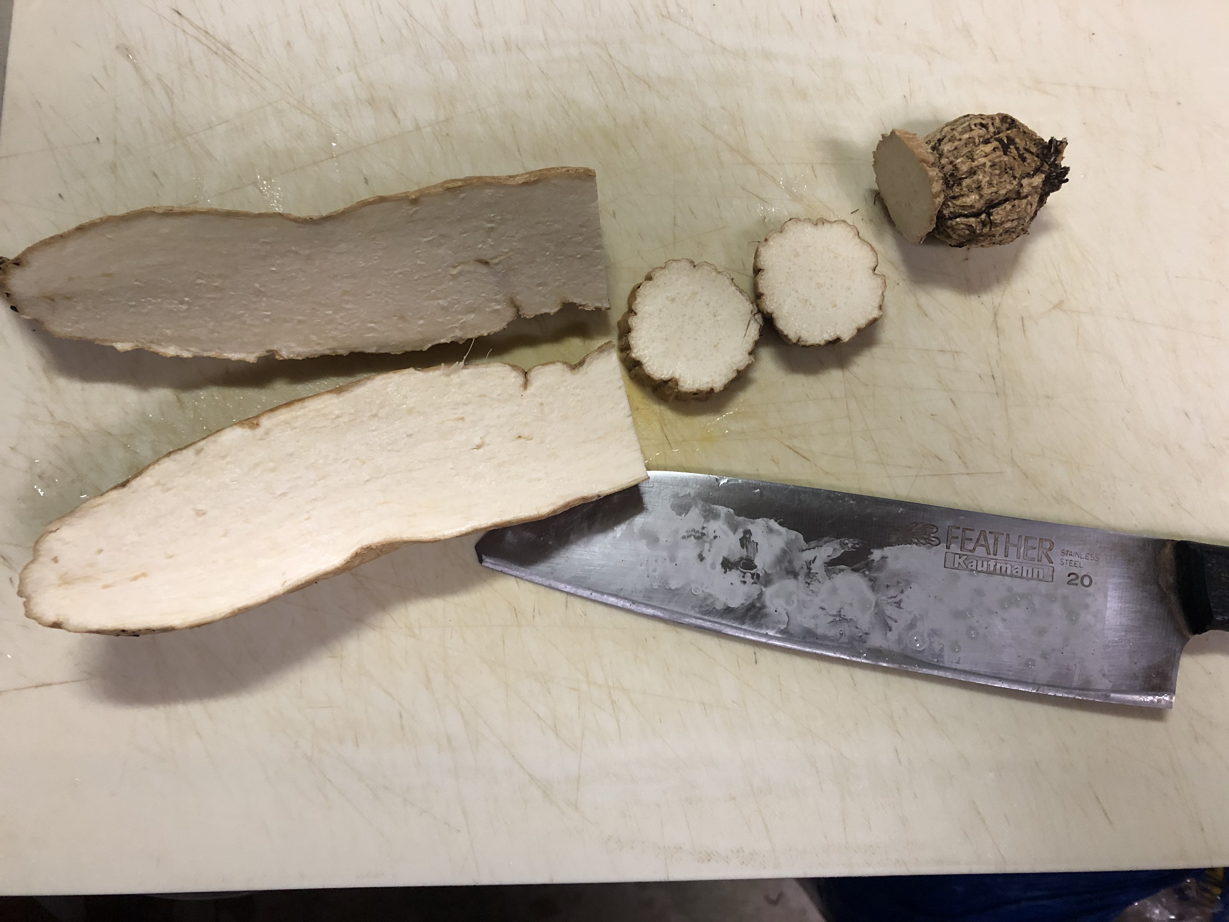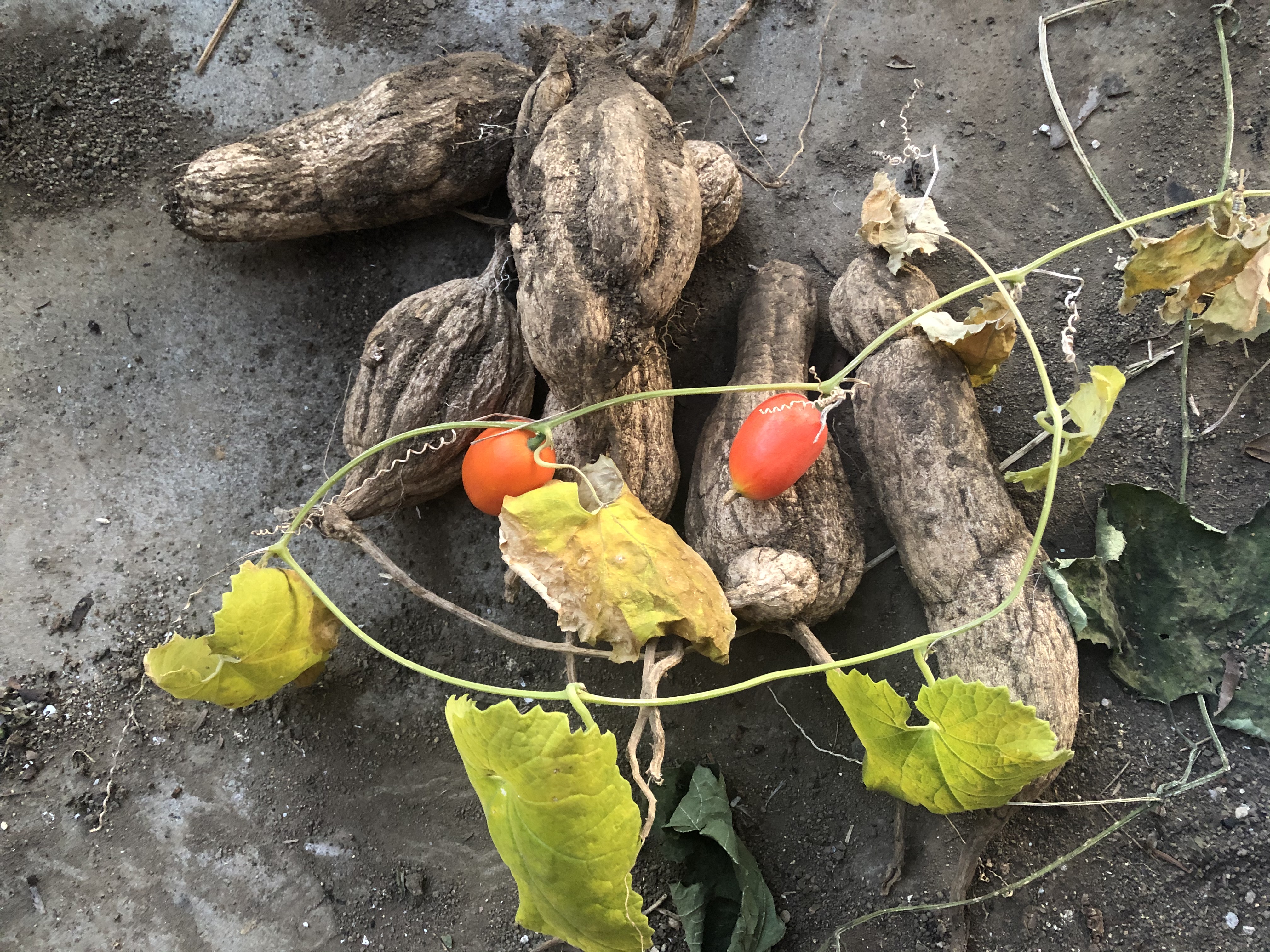 カラスウリもデンプンたっぷりのお芋を作るんですよ。写真は株もとにできたお芋ですが、晩夏にはつる垂れさがるように下に伸び、先が接地すると地下に伸びてお芋を作るなどというけったいなことをします。今年はウリ科にはつらい夏で、キュウリの値段は高止まり、地場もんのやっすいゴーヤーが出回らず、うちのカラスウリもあまり伸びず、残念ながらつるの接地は見られませんでした。