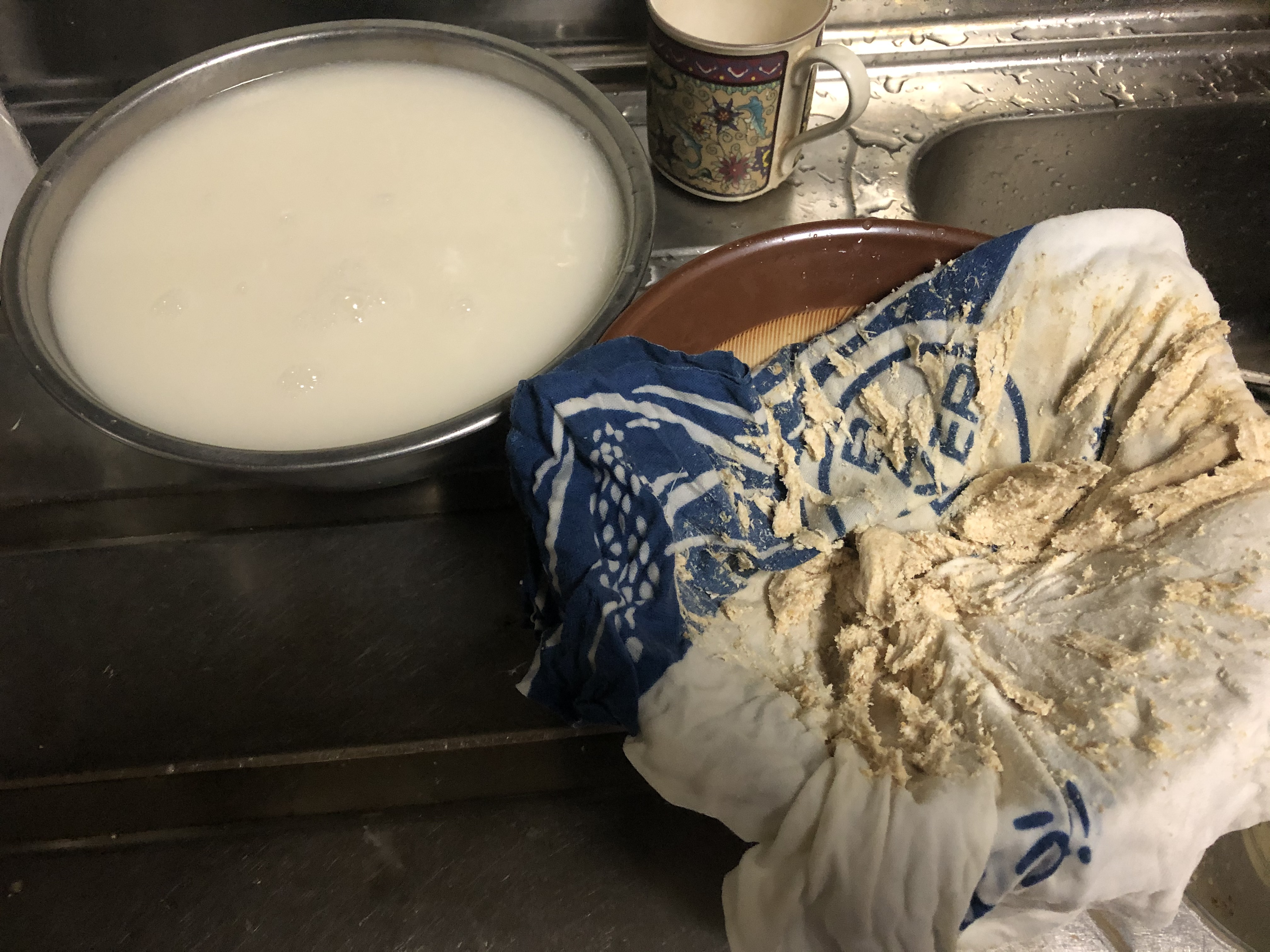 3回目には水があまり濁らなくなったので振り出しはこれで終わりとし、ボウルの水に上澄みが出てくるのを待って捨て、3つのボウルの中身を一つに寄せました。とろりとした上澄みを捨て、きれいな水を足して混ぜ、また上澄みを捨てることを3回繰り返しました。まだ濁りは出るんだけどデンプンも流しちゃっているようなのでデンプンを回収することにしました。