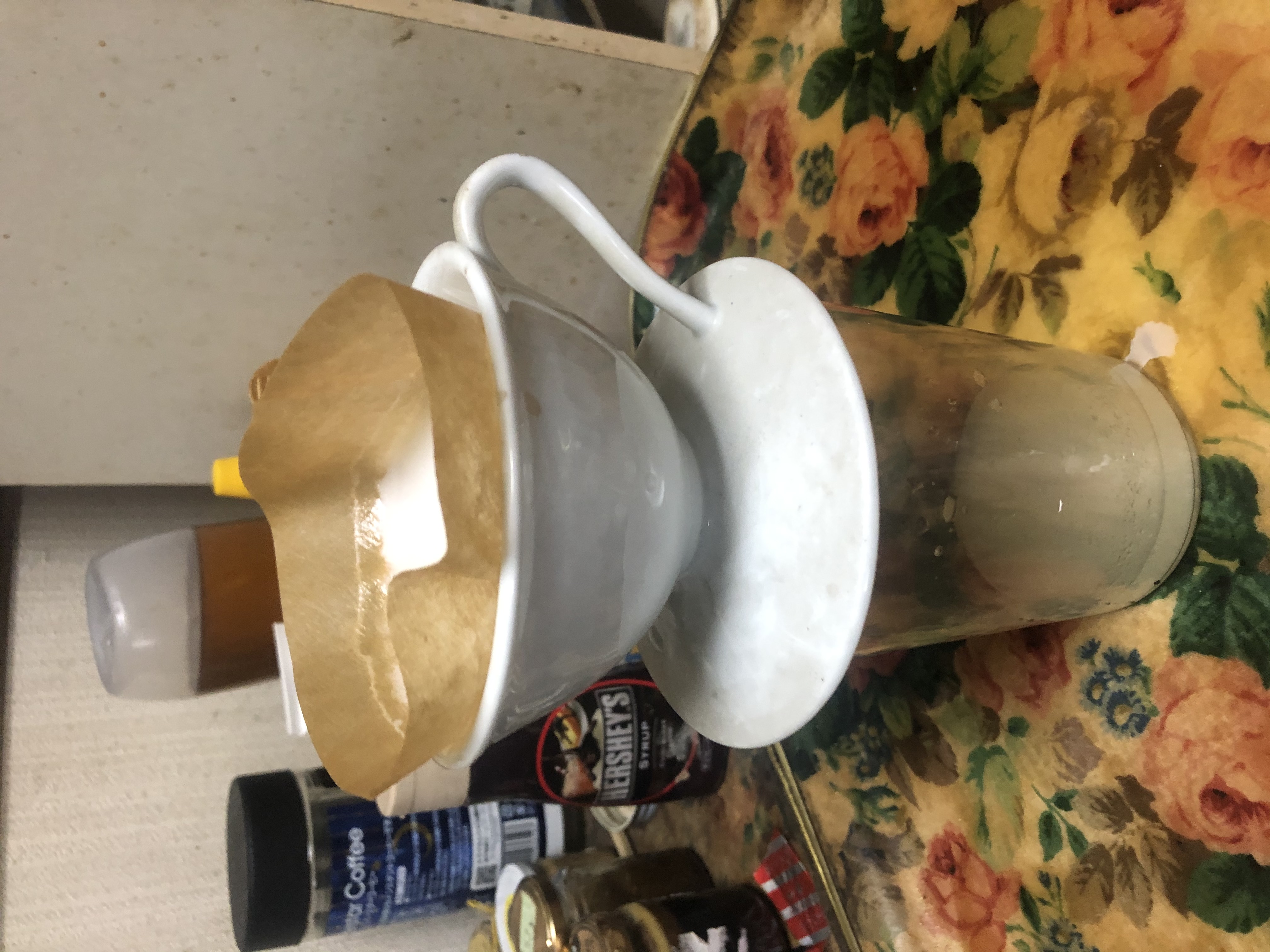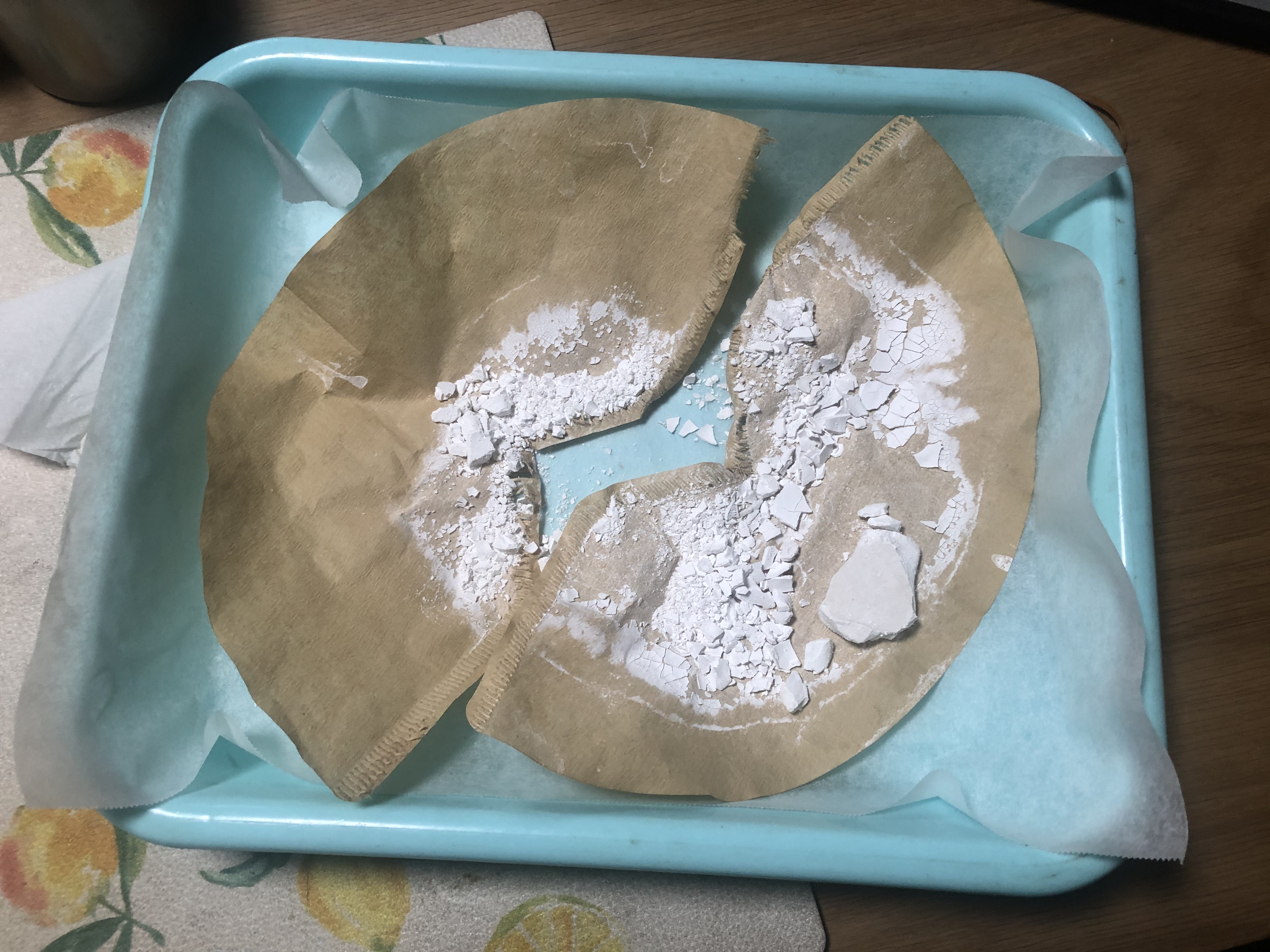 コーヒードリッパーにペーパーフィルターをかけ、ボウルの水をかき混ぜて底にたまったデンプンを水に浮かし、フィルターに流し込みました。コーヒーフィルターって、実験用のろ紙よりも目が粗そうな気がする。月並みな2番のろ紙で保持粒子径5μmだっていうから、カラスウリのデンプン粒が細かいと抜けてしまうかなと心配になり、漉されて落ちた水を見ました。わずかなデンプン?が底にたまっていますが、ほんのわずかであるようなので気にしないことにしました。ところがしばらくほっといたらフィルターの目が詰まって水が落ちなくなりました。フィルターをもう一枚用意して、溜まった水を移し、無事に白い粉を漉し取りました。