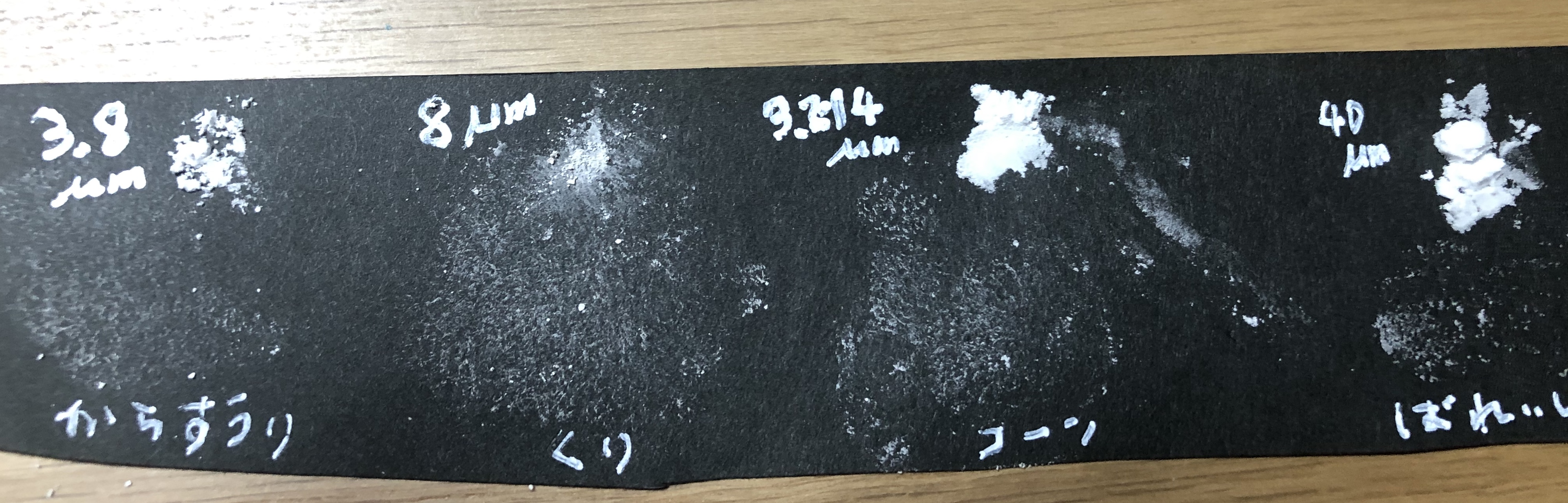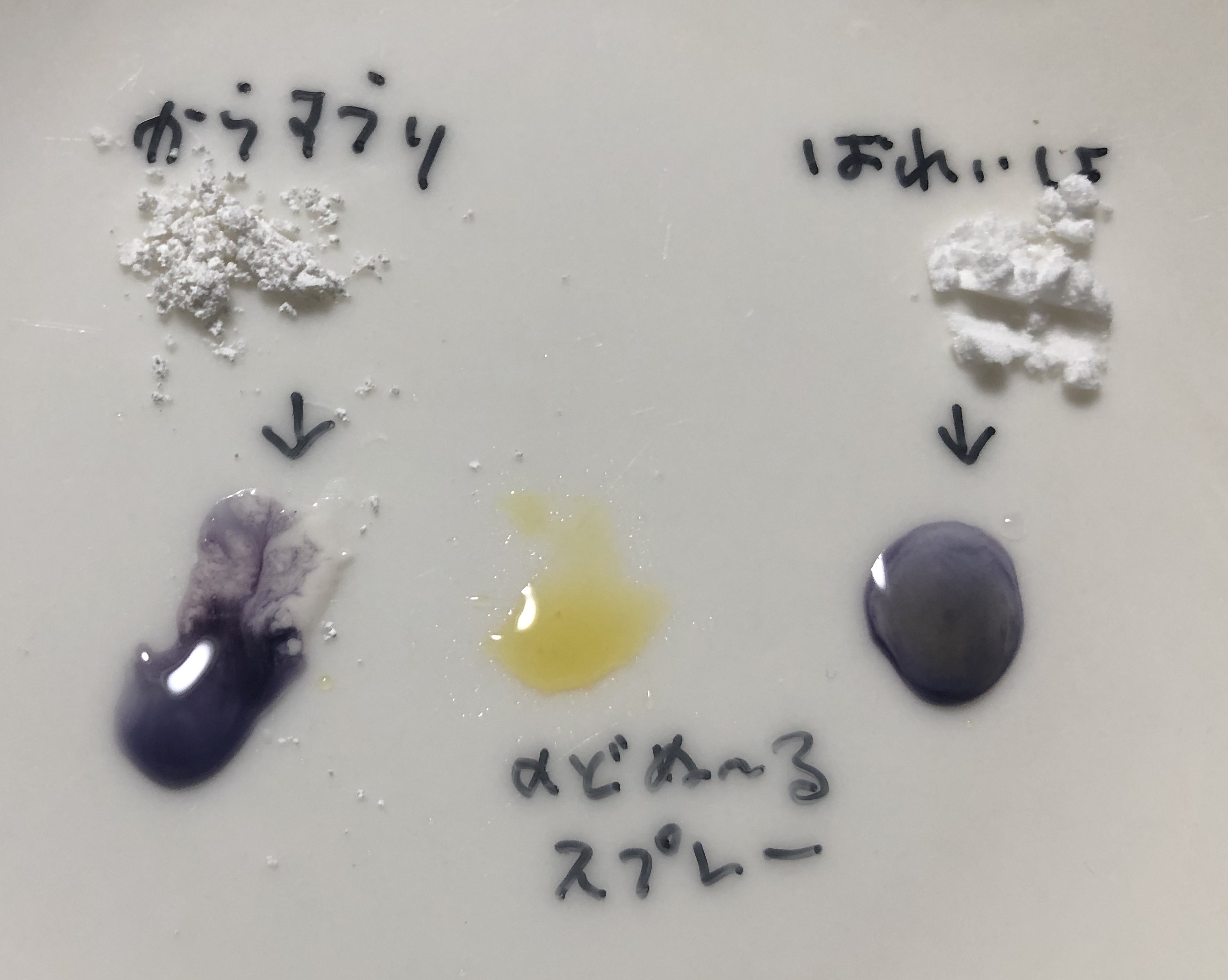 得られた白い粉がデンプンであるかどうか確認します。小学校でやりますよね、「ヨウ素液」を使った実験。ヨウ素液ってどこで買えばいいの、って、普通のご家庭にあることも多いんですが。コロナがらみで最近話題になったうがい液やのどに噴射するスプレー、あれでいいんですよ、ポビドンヨード。