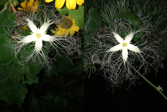 夜の闇に浮かぶように咲く、カラスウリの花。左が雌花、右が雄花です。繊細なレース飾りは朝にはしぼんでしまうから、夜のお散歩のお楽しみ。雌花の中央に3つに分かれた柱頭(ちゅうとう:めしべの先端の、花粉を受け取るところ)が見えますか。雄花中央のおしべは分かれているように見えません。もっと確かなのは、花の根元を見ること。雌花の付け根には小さなうりがついていますよ。